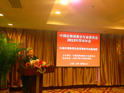 本次会议的主题是“先秦时期秦晋法家思想研究的新视野”。与会学者围绕与秦晋法家有关的诸多问题进行了充分的讨论与交流。中国法律思想史专业委员会会长武树臣教授在开幕式中致辞,并在第一单元做了题为“从殷末之‘法’到周初之‘法’——神判法向人判法的转型”的发言。副会长林明教授致闭幕辞。常务理事傅礼白教授主持第三单元的讨论。秘书长马建红副教授在闭幕式中对本次年会的特点进行了总结,并对2014年年会的筹备及召开做了部署。
